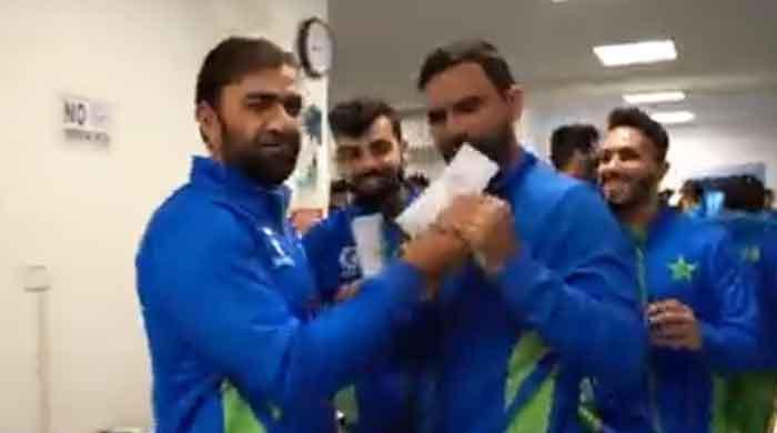 Iftikhar Ahmed brings smiles to team players by handing over eidi envelopes one by one as they wait for their turn